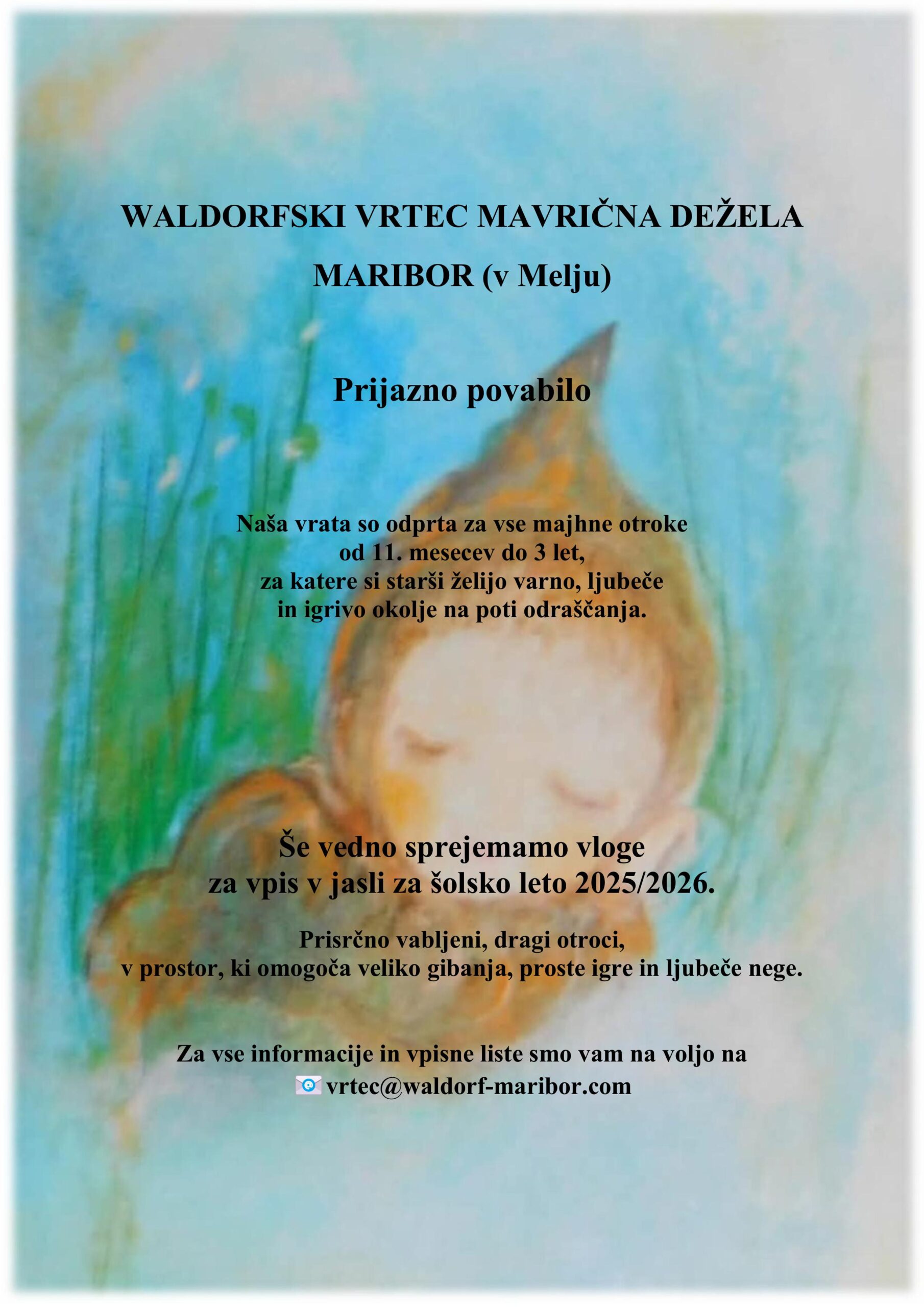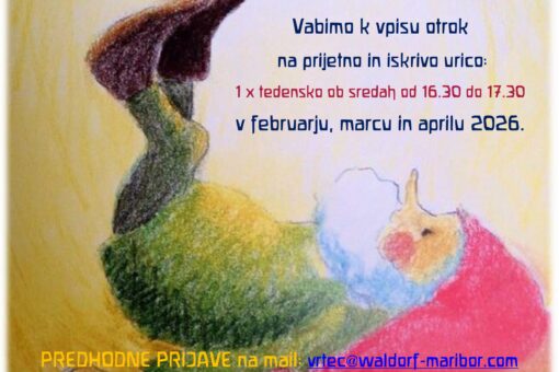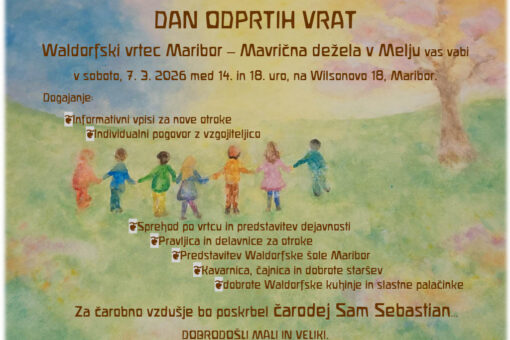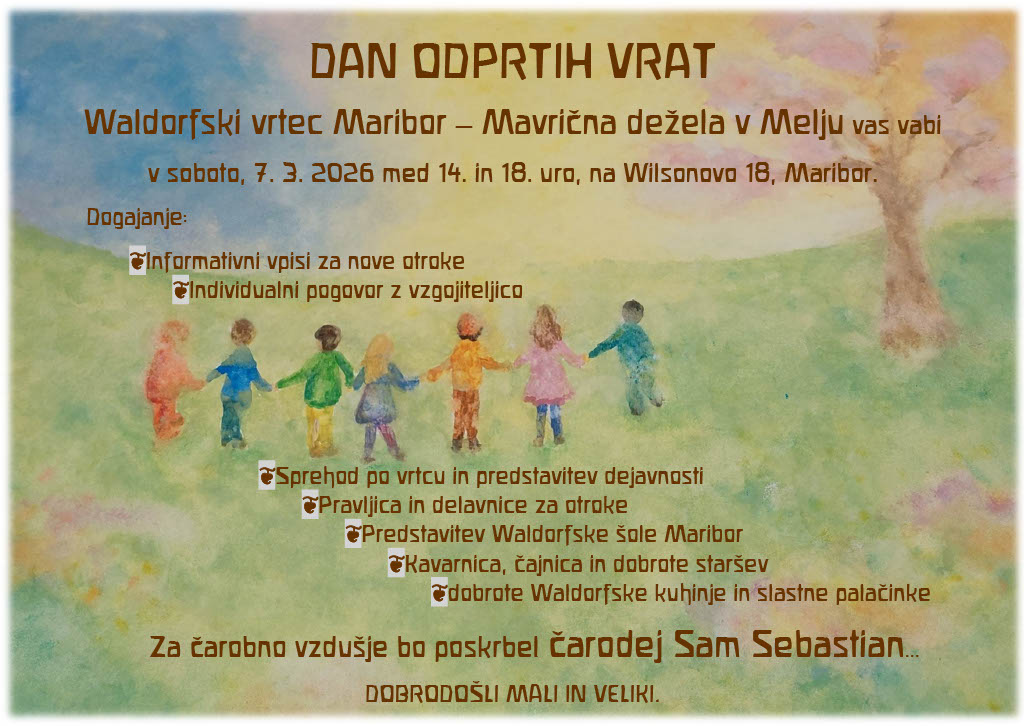 WALDORFSKI VRTEC MARIBOR – MAVRIČNA DEŽELA v Melju, Wilsonova 18, obvešča starše, da smo pričeli z zbiranjem vlog za vpis otrok v vrtec za šolsko leto 2021/2022. Prisrčno vabljeni k izpolnitvi vloge za vašega otroka, ki jo po želji lahko prejmete na elektronski naslov ali jo najdete na spletni strani vrtca pod zavihkom O nas -Vpisni postopek ali vam jo pošljemo po pošti. Pišite nam na elektronski naslov waldorf.vrtec@amis.net, da vam jo lahko posredujemo ali pokličete na tel. št. vrtca 02 42 15 350. Zbiranje vlog bo potekalo do 31. 3. 2021, oziroma do zapolnitve mest.